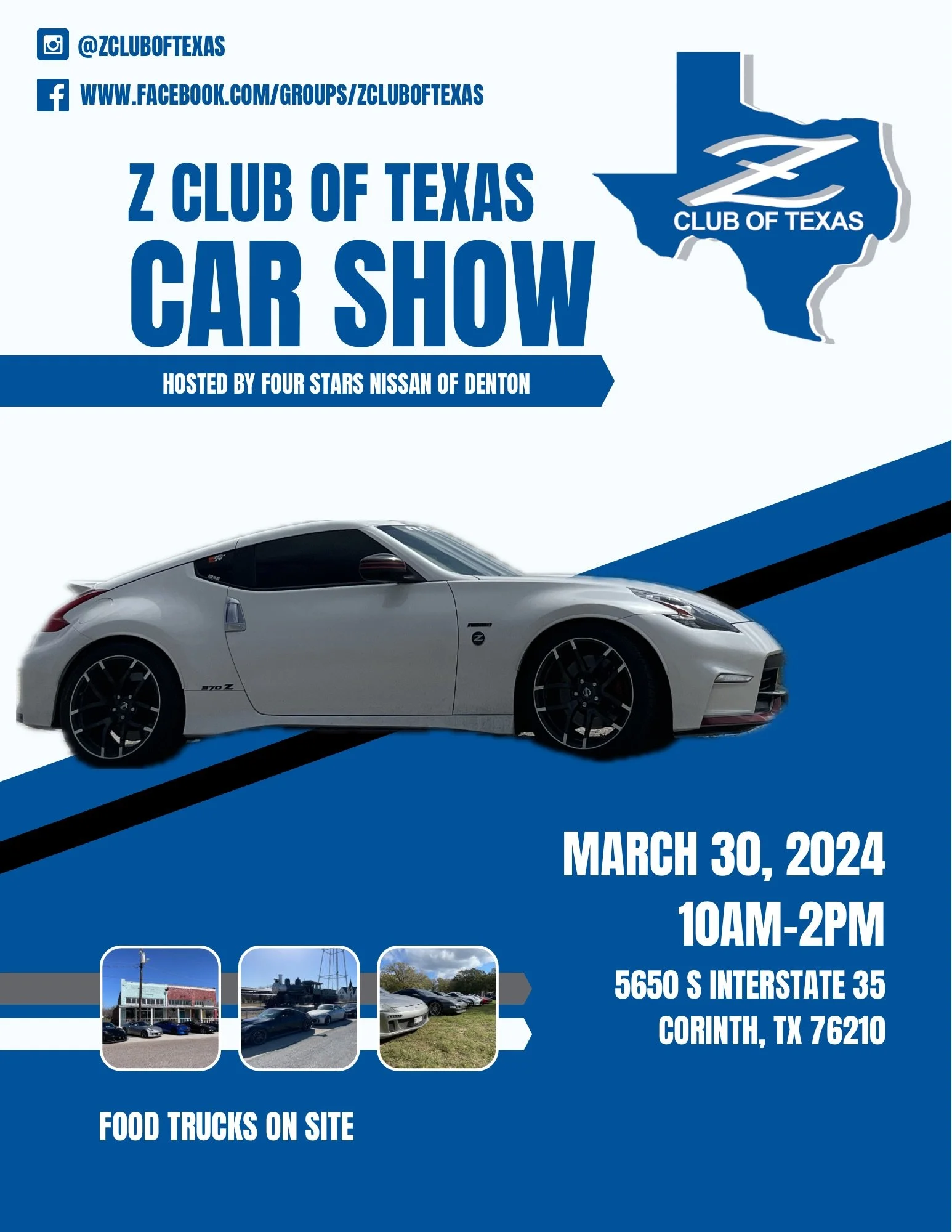 Z Club of Texas Car Show Saturday, March 30, 2024 10:00 AM 2:00 PM 10:00 14:00 Google Calendar ICS March 30th 10a.m.-2p.mFour Stars Nissan of Dentonat 5650 S Interstate 35, Corinth, TX 76210***Food Trucks on site.***